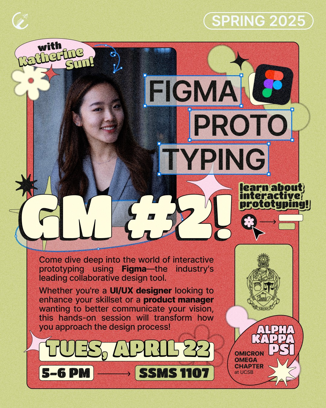 Every event I designed for, I approached as its own visual brief. For the Figma Prototyping Workshop, a collaboration with Kathy Sun and her organization Alpha Kappa Psi, I saw a real opportunity. The partnership was already going to help drive attendance, but I wanted the graphic itself to do work too. I wanted it to feel like prototyping: energetic, layered, a little overwhelming in the best way, like something reaching out of the screen at you.