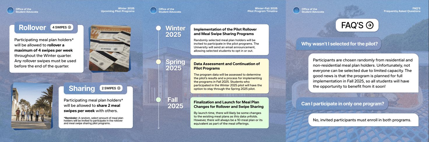 But the more interesting design challenge was figuring out what to say. I had to balance two distinct modes of content: organizational visibility (who we are, what we do) and genuine usefulness (information students actually care about). The posts that performed best were the ones that delivered real value: a breakdown of changes to the UCSB Dining Hall meal plan system, sourced directly from the Student Advocate General, which generated strong engagement and curiosity about what else we had to report. A "How to Use GoGaucho" post highlighting features our own tech committee had worked on. An AI panel Q&A addressing student fears about academic integrity and AI detection: timely, specific, and exactly what the audience needed.